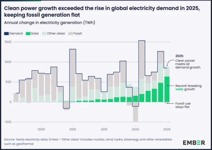 “Record solar growth meant clean power sources grew fast enough to meet all new electricity demand in 2025, thereby preventing an increase in fossil generation,” the report noted — marking the first year since 2020 without a rise in fossil fuel-based electricity generation, and only the fifth such year this century.