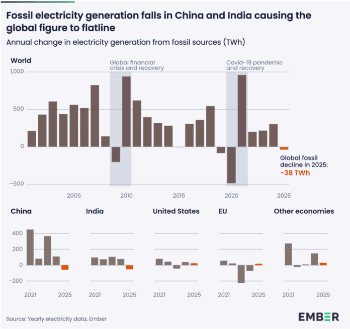 A notable development in 2025 was the simultaneous decline in fossil fuel generation in both China and India — a rare occurrence that played a key role in the global shift.